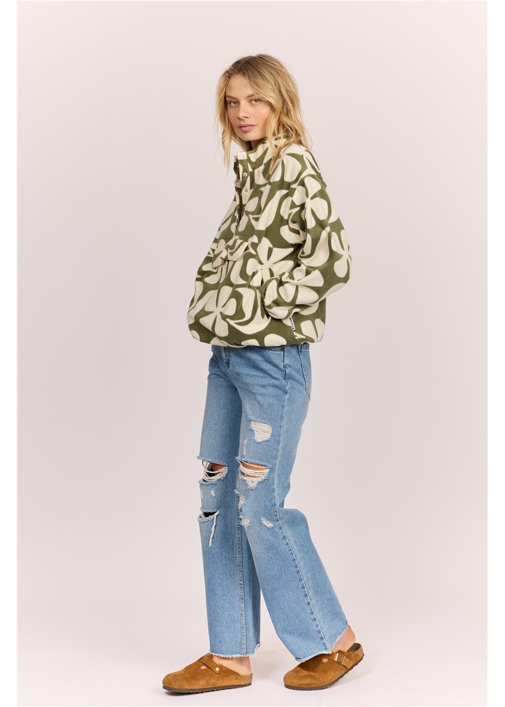 Cozy up in our Waves In Bloom Fleece, a dropped shoulder pullover that's as soft as a cloud and twice as fun. This fuzzy favorite features a handy front flap pocket perfect for stashing your essentials, while gathered sleeve openings and hem create a playful, tailored silhouette that keeps things interesting. Whether you're lounging at home or heading out for casual adventures, this fleece wraps you in warmth without the fuss. The relaxed fit and touchable texture make it an instant go-to for anyone who believes comfort should never compromise on style.